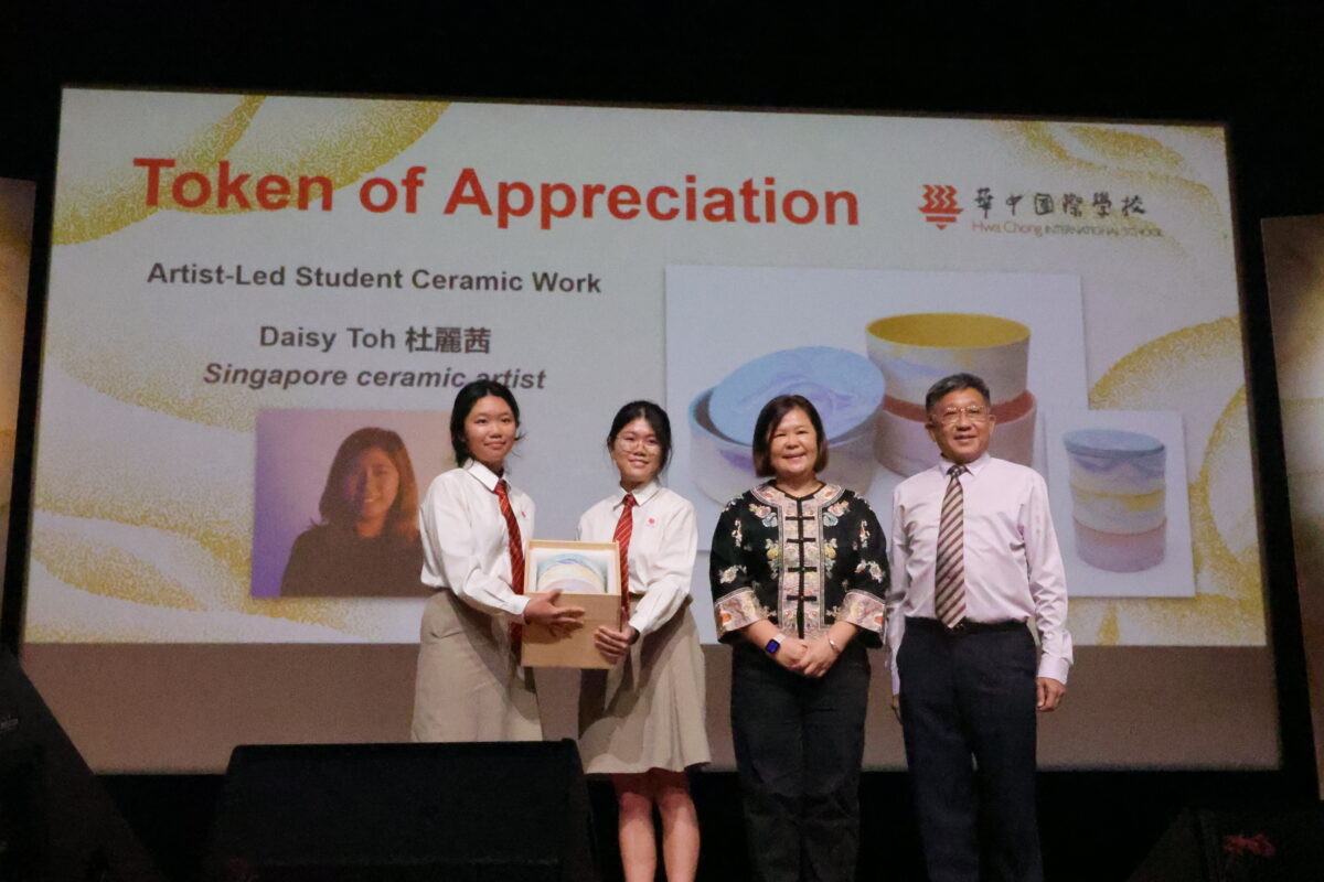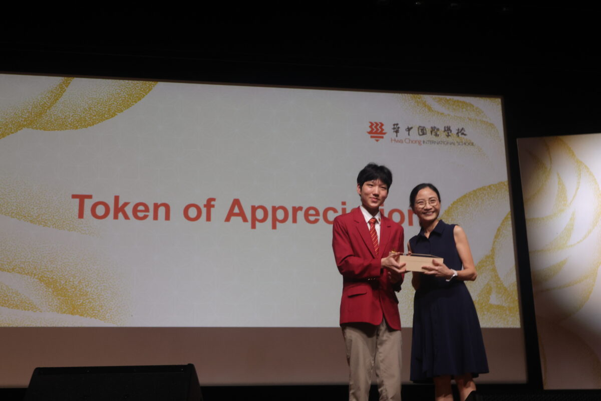 学生代表赠送感谢信物给林德兴先生(新加坡南洋华侨中学副董事长暨华中国际学校董事)